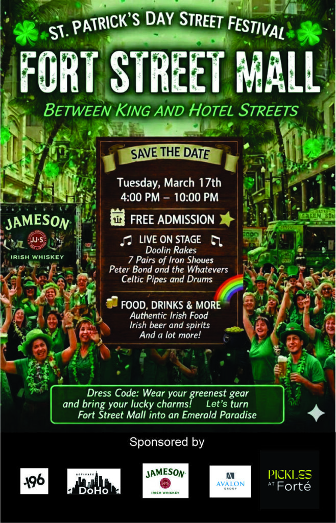The Saint Patrick’s Day Festival will offer Irish music, food, and drink on Fort Street Mall between King and Hotel street, on Saint Patrick’s Day, Tuesday, March 17, from 4pm till 10pm. On St. Patrick’s Day in 1988, Events International created the street festival on Nu’uanu Avenue that became the place to be for the wearing of the green. It was a yearly tradition until 2020, when the event didn’t happen due to COVID, and it hasn’t happened since. Events International and the Fort Street Mall Business Improvement District are pleased to bring this beloved, free to the public, event back to the community, this year on Fort Street Mall sponsored by Jamesons, -196, and Pickles at Forte.