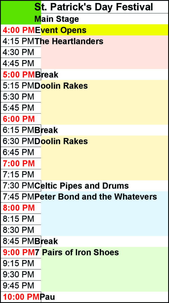 As in the past, there will be Irish music on two stages, pop up performances by the Celtic Pipes and Drums of Hawaii and other roving musicians, and a great array of Irish food and drink. There will be 10 food vendors selling Irish delicacies such as oysters, corned beef and cabbage, fish and chips, and bangers and mash. An indoor dining hall will be set up at Pickles at Forte, adjoining the mall. Bars on the mall will be selling Irish beer and spirits including Jamesons and Guinness. Musical acts will include Doolin Rakes, Peter Bond and the Whatevers, 7 Pairs of Iron Shoes and the Heartlanders.